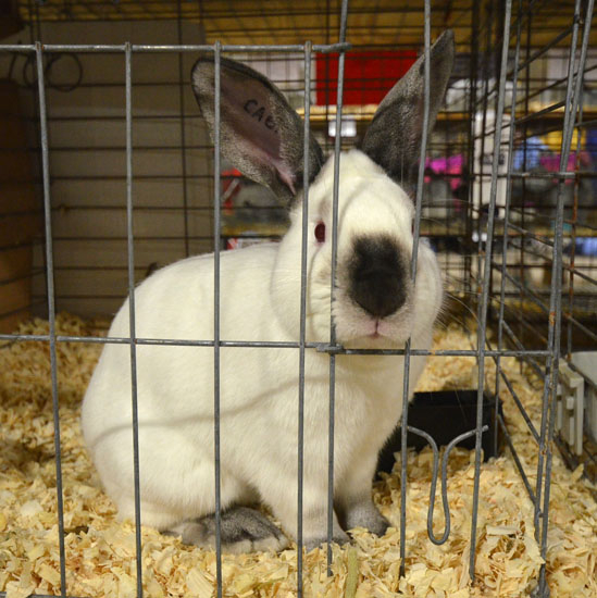 The Californian breed originated in California in the 1920's, created by crossing Himalayan, Standard Chinchilla and New Zealand white rabbits. The fur pattern has a white body and black nose, ears, feet and tail. The eyes are pink or red. The Californian breed has an ideal adult weight of 8 to 10.5 pounds.
