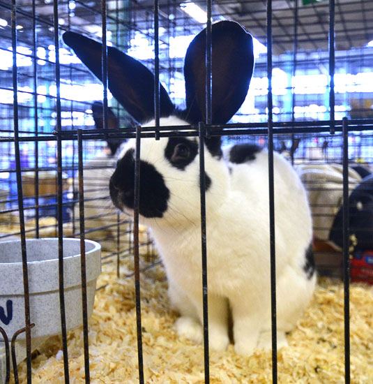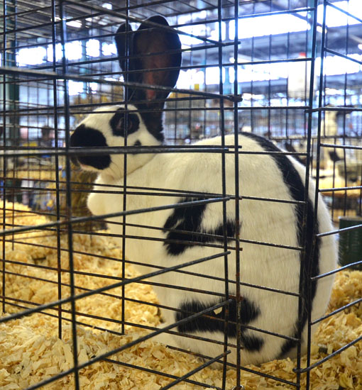 As the name implies, the Checkered Giant is a large rabbit, with an ideal adult weight over eleven pounds. They have white bodies with dark markings in black or blue. The dark markings are: two large spots (or groups of spots) on each side, behind the mid-point of the body, a "racing stripe" along the spine, a "butterfly" on the nose, circles around the eyes and a spot on each cheek. The ears are also in the dark color.