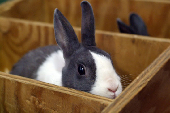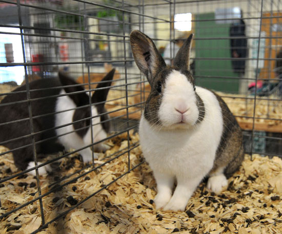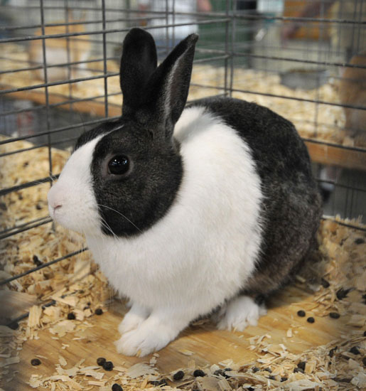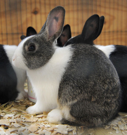 The Dutch rabbit is easy to spot - it has a dark-colored body with a white "saddle" across the shoulders and a triangular white "blaze" on the face. The darker fur can be black, blue, chocolate, gray (the hair has bands of color in blue and shades of tan), steel (black hairs with lighter tips) or tortoise (shaded orange/blue).