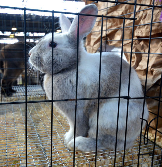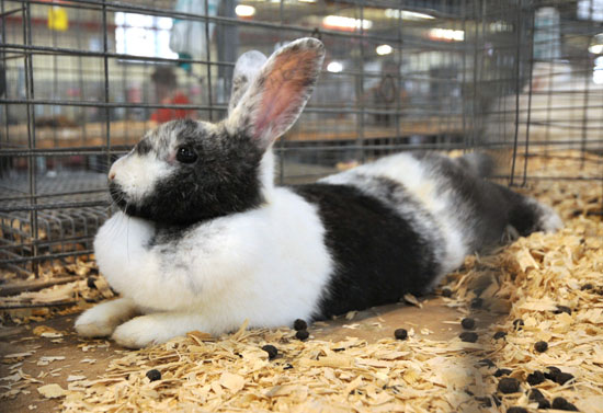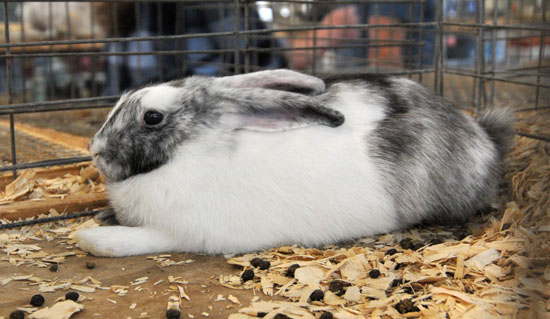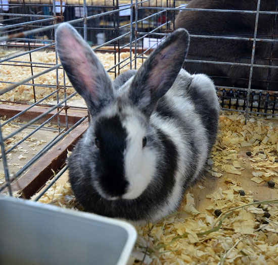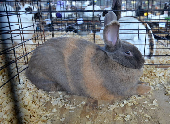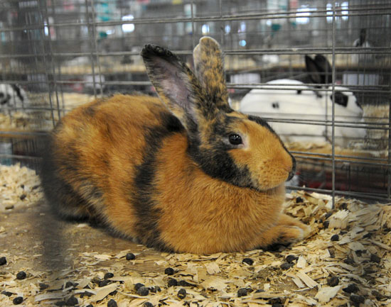 The Harlequin rabbit is distinguished by its colorful and dramatic fur markings. There are two types - Japanese and Magpie. In both varieties, the markings make one think of a medieval joker or clown (hence, "harlequin") - a face split down the middle, darker and lighter body stripes (colors go right around the rabbit's body) or bars (bars are offset on one side of the body and the other).