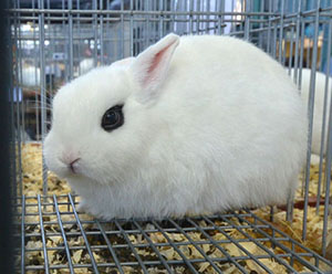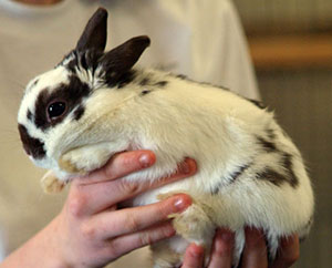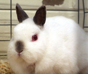 Dwarf HototHotot (pronounced "Hoh-Toh") breeds are very distinctive - white rabbits with dark "mascara" around their eyes. Dwarf Hotot rabbits have a maximum adult weight of only three pounds. |